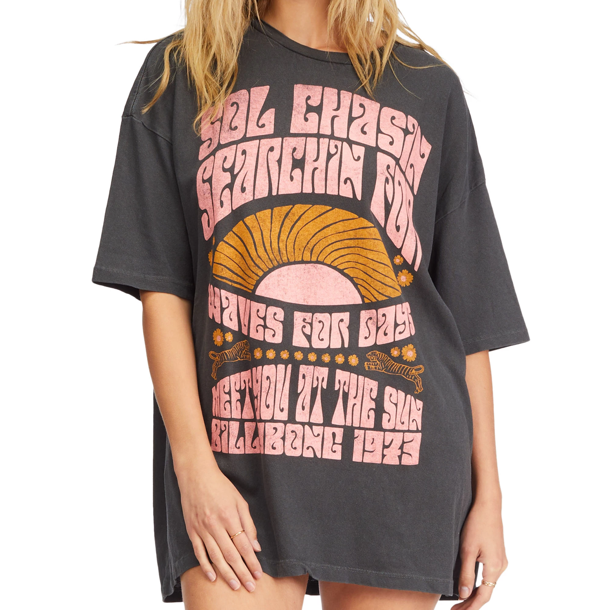 The Billabong Women’s Sol Chaser T Shirt is the first vibe you’ll want to put on in the morning. This classic T Shirt has an oversized look that will pair perfectly with jeans or shorts. It is made with soft, lightweight cotton and features a loose crew neck for optimum comfort and coverage. An original retro Billabong screenprint in soft hand ink featured offers plenty of feel-good vibes for the day. The Billabong Women’s Sol Chaser T Shirt is the perfect addition to your summertime aesthetic.