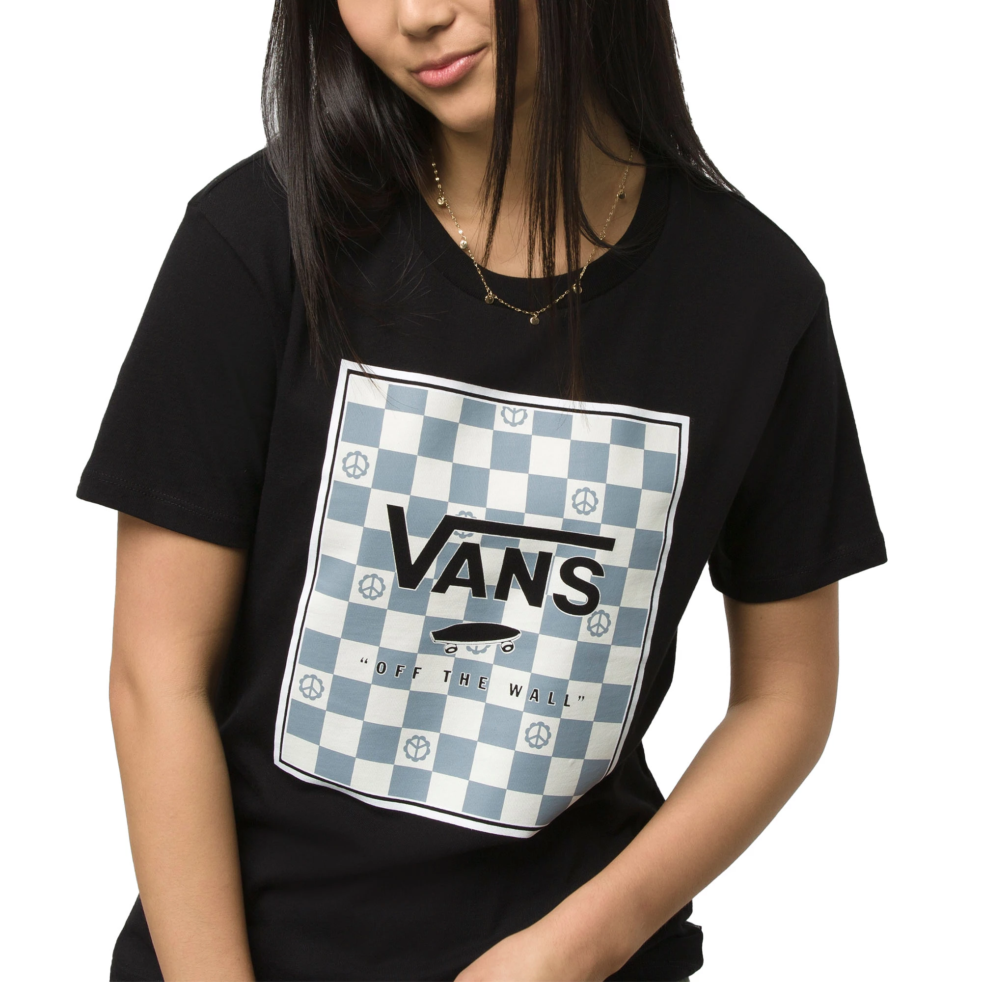 The Vans Women’s Poppy Box Relaxed Crew T Shirt features a checkerboard and peace sign fill. This short sleeve crewneck t shirt is made with heavyweight 100% cotton jersey for a classic look and feel. Classic boxed logo graphics get an upgrade with this shirt.